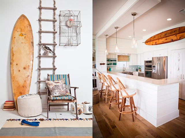 Es decir por ejemplo puedes tener un póster surfero en la pared, pero este póster puede ser de una película antigua de surf, rollo vintage. Luego los muebles que puedes tener en ese mismo espacio, pueden ser decorados en plan playero, con un blanco gastado y con algunos detalles marinos, como estrellas de mar, tarros con arena, una tabla de surf de madera o cualquier otra cosa que te haya gustado. Está muy de moda realizar pequeños complementos con troncos y ramas gastadas por el mar.